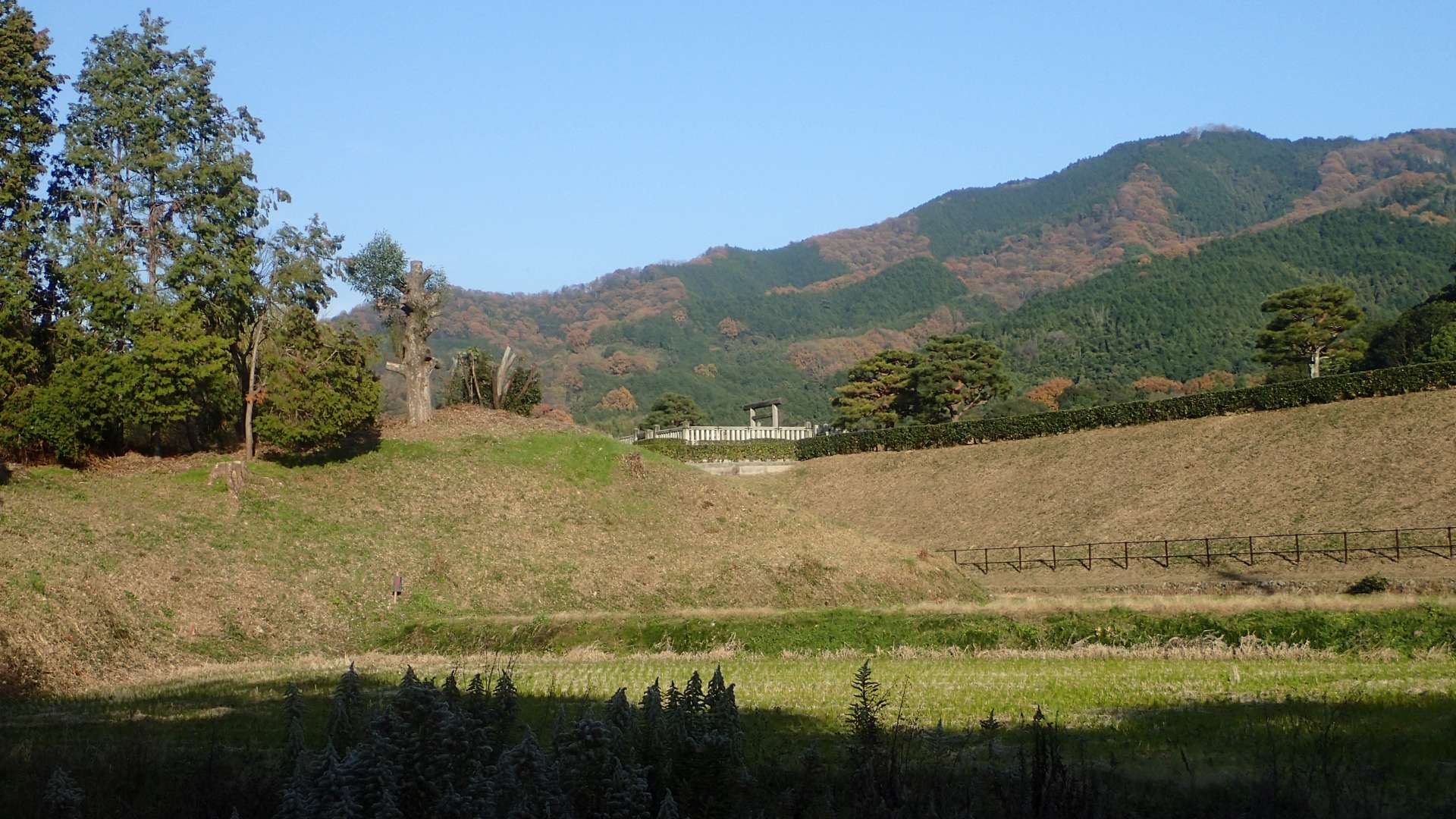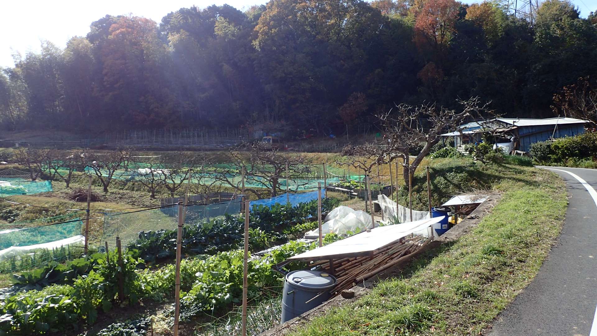 景行天皇陵墓の脇道。時間は3時を越えた。最終目標のJR和歌山線吉野口駅を諦め、橿原神宮駅もしくは飛鳥駅に変更。ところがこの後、桜井手前で思わず転倒事故。なんとか明日香越えをして飛鳥駅へ向かう。