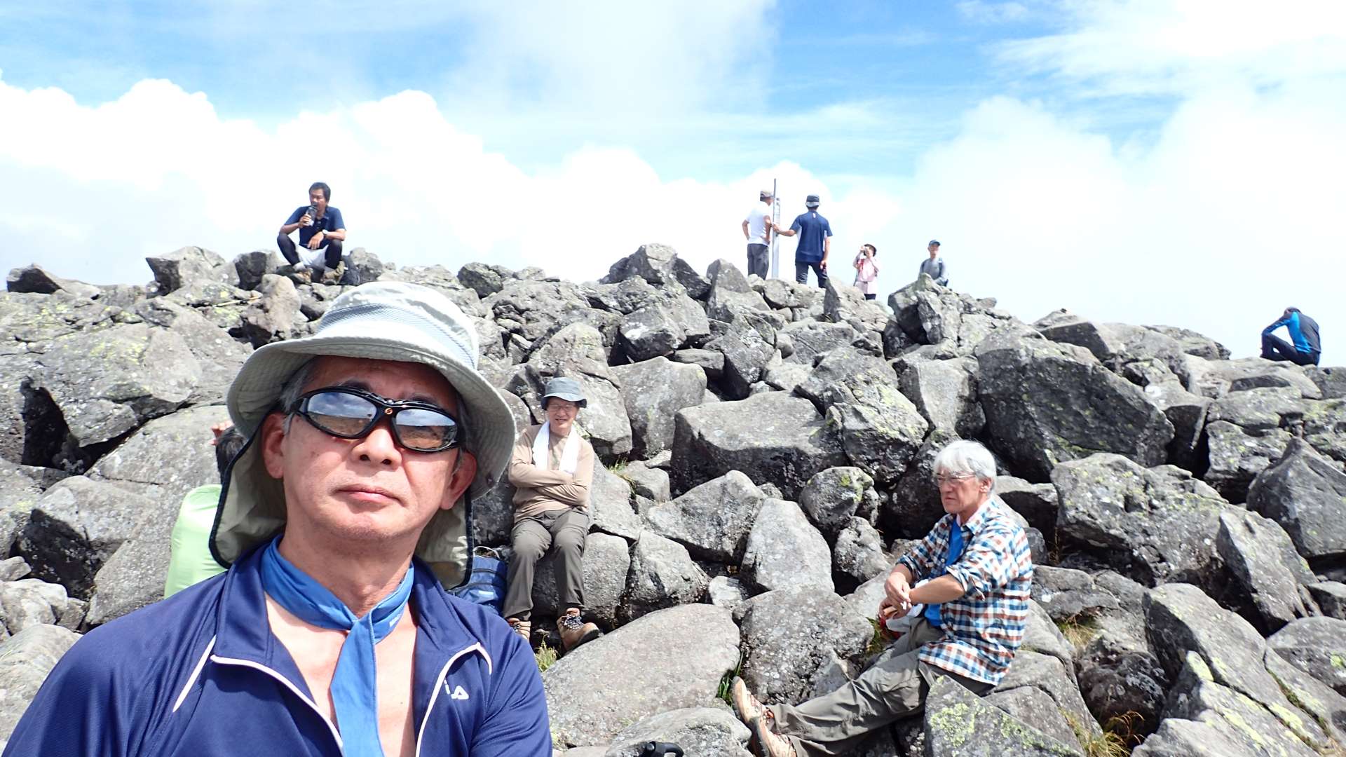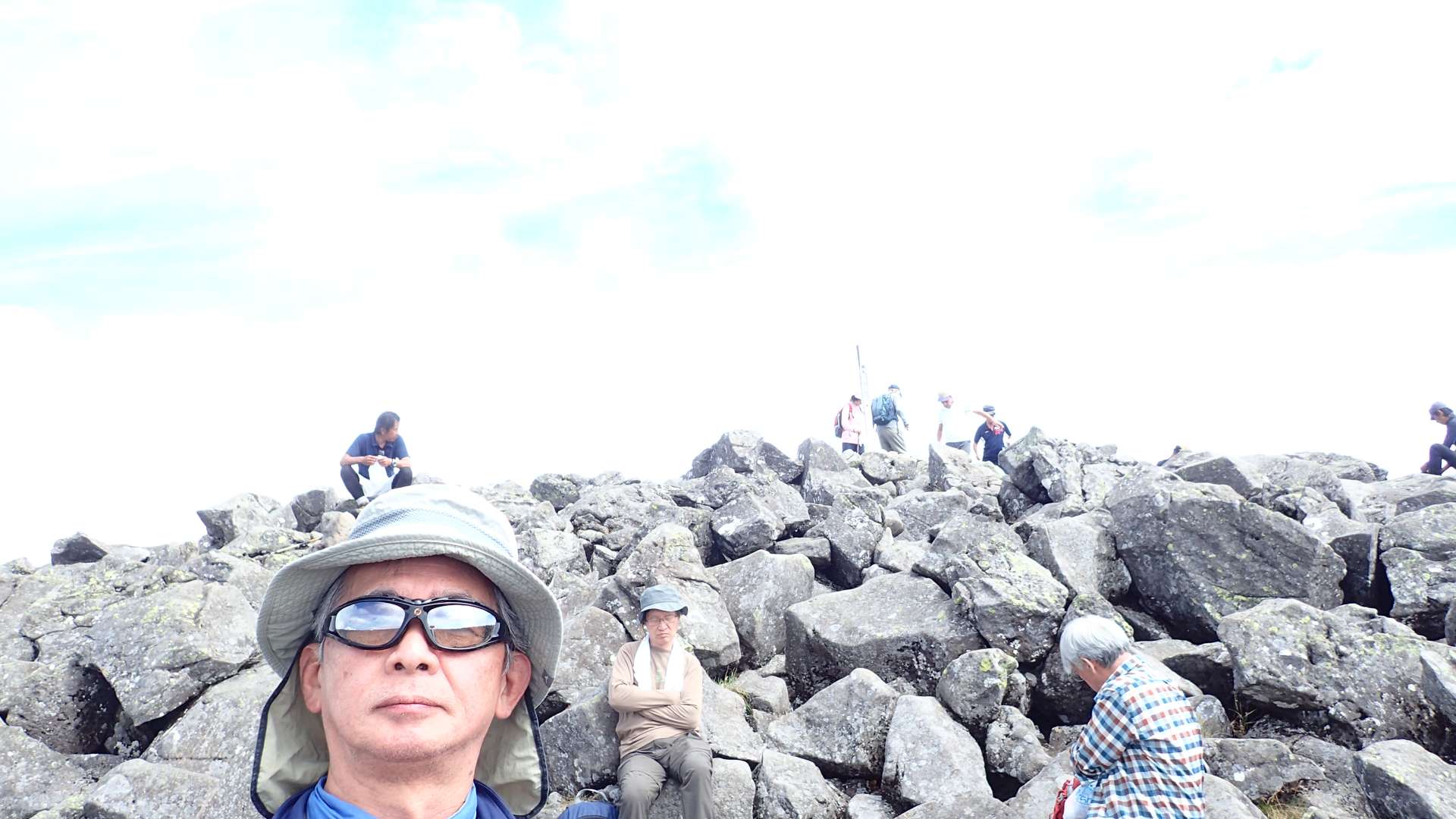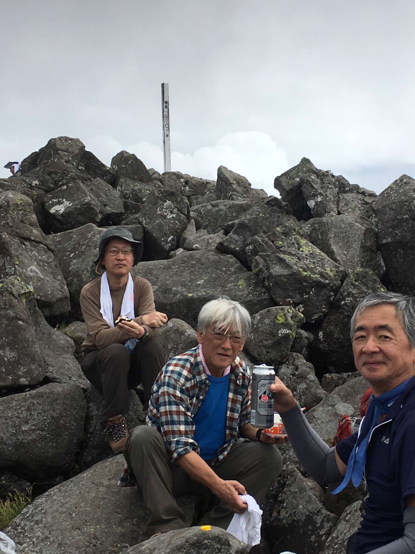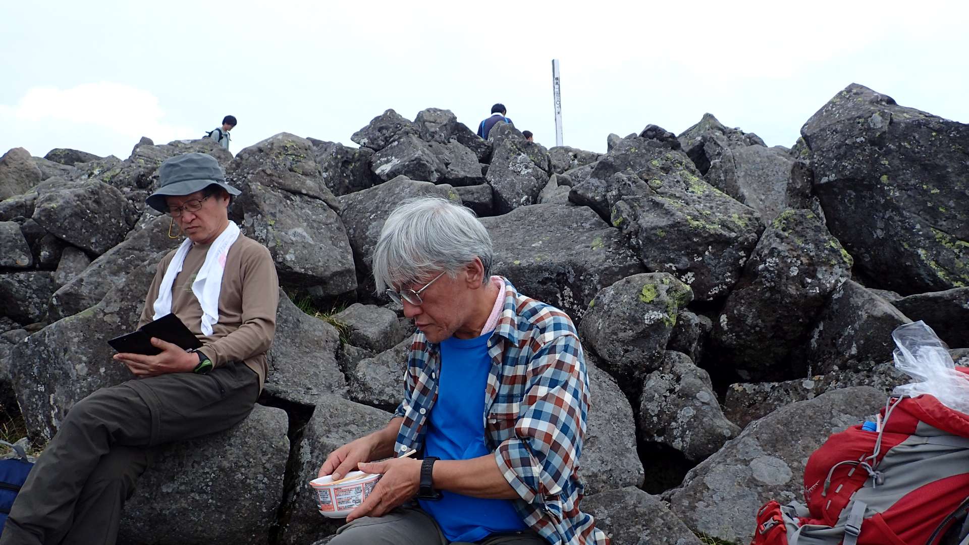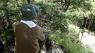 急な岩登りで汗が出てきて小休止。