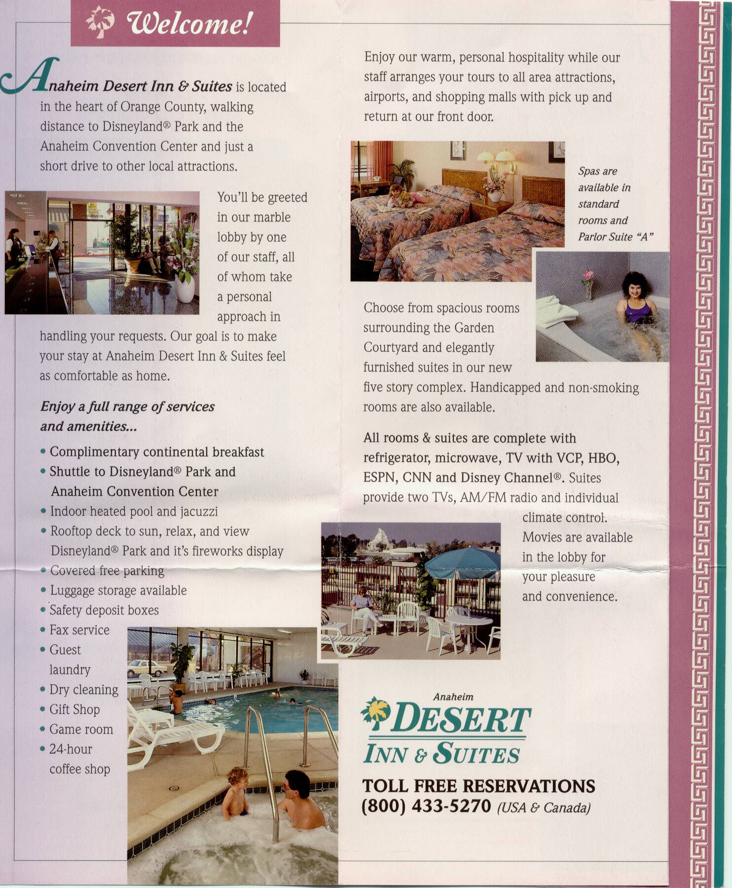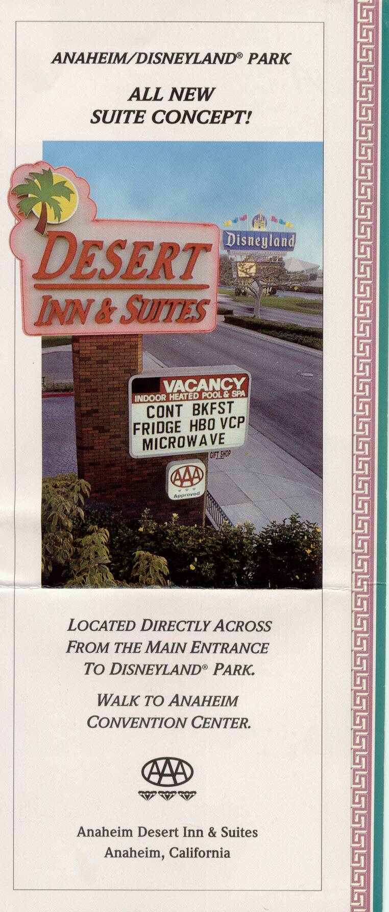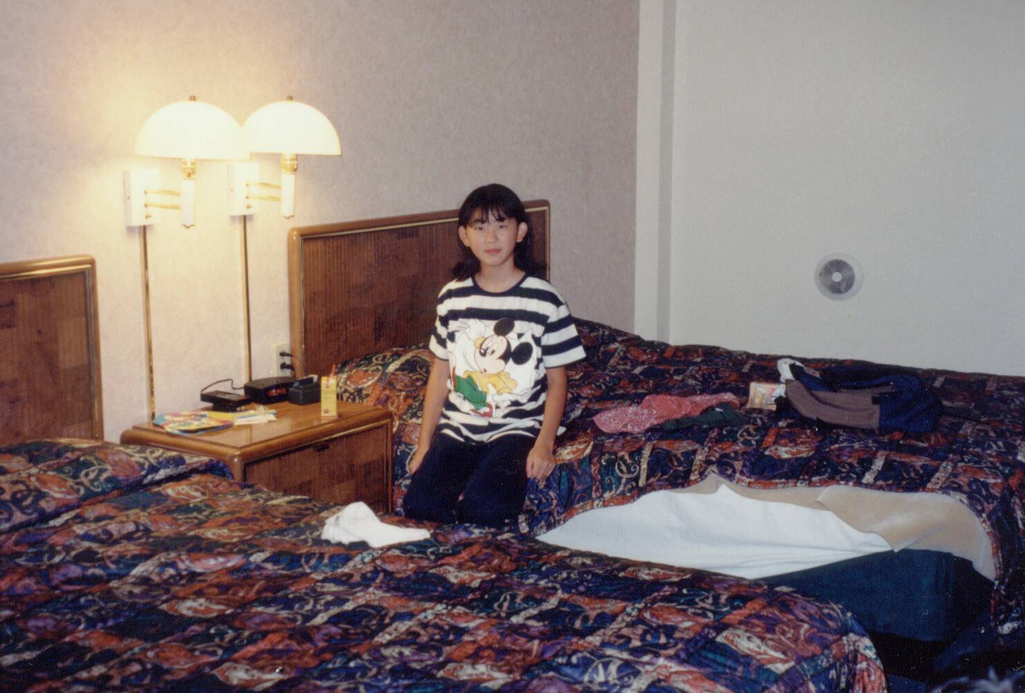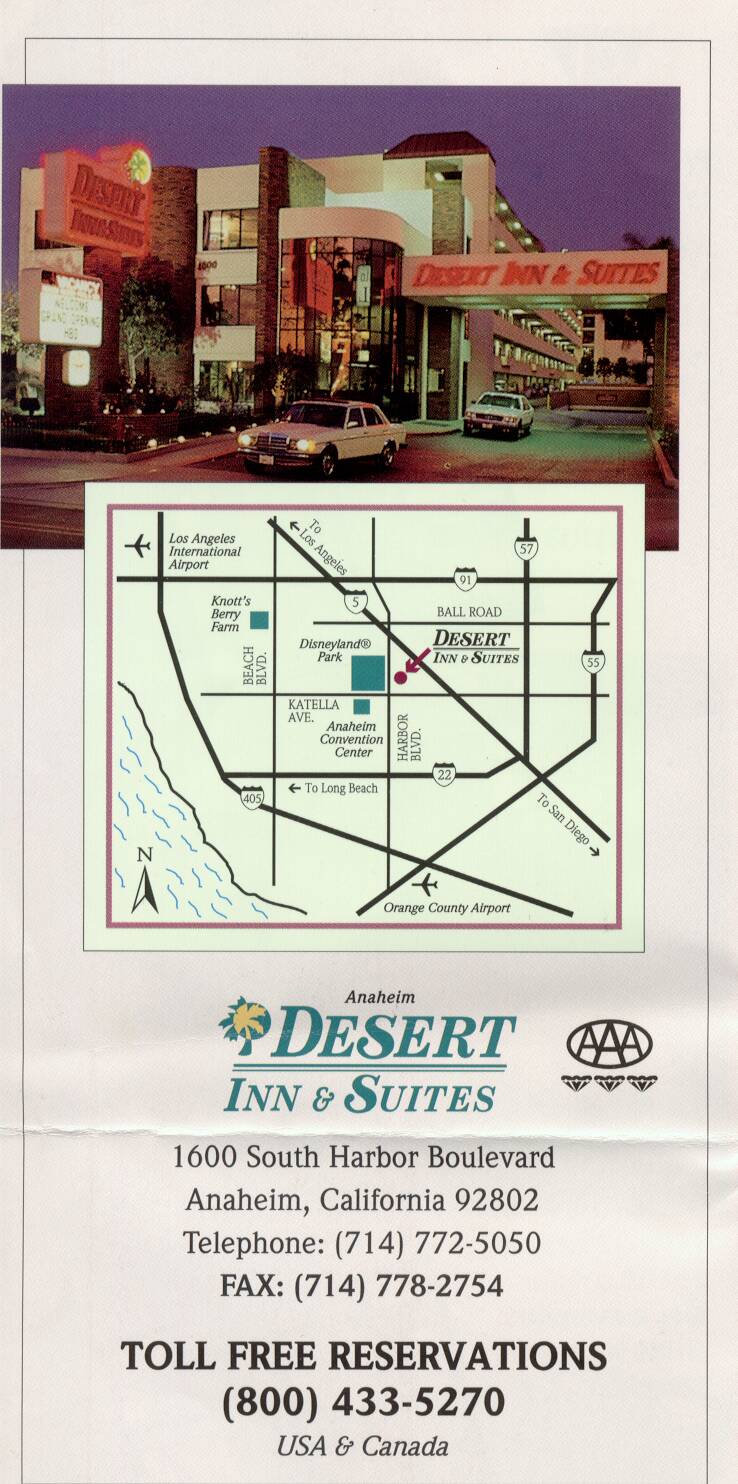 モーテルは日本からFAXで予約済み。浴室の蛍光灯がつかないので電話したが、なかなか直しに来ないので、勝手にいじっていたらつくようになった。きれいなジャグジーがついていて感激したが、お湯が出ないでシャワーのみ。でも窓から目の前にディズニーランドのブルーマウンテンが見え、道路に沿ってディズニーランドホテルからのモノレールが走っている。この近くにはこんなモーテルがいっぱいで、ここならディズニーランドで深夜まで遊ぶことができる。このねらいは正解であった。